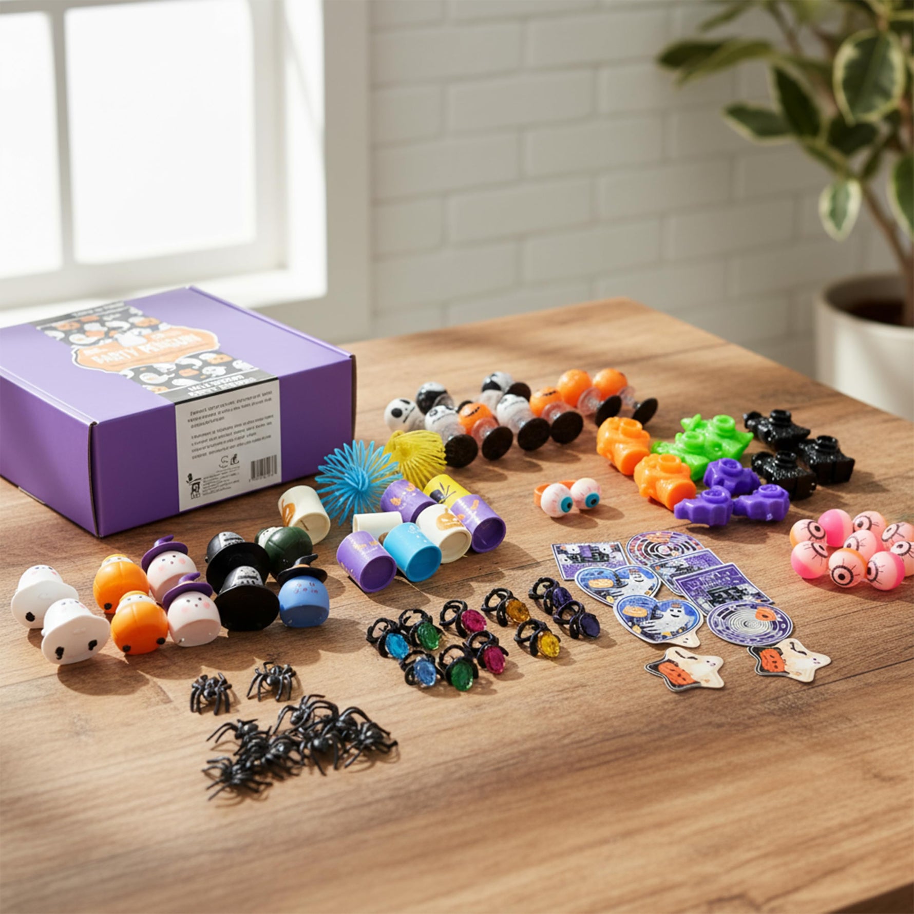 Keep the laughter going with colorful Halloween toys that delight boys and girls alike. From sparkling rings and whistles to bouncy balls, maze puzzles, and creepy spiders, each toy adds excitement and variety to the celebration. The mix ensures kids get different surprises — perfect for Halloween treasure hunts, pumpkin carving nights, or carnival booths.